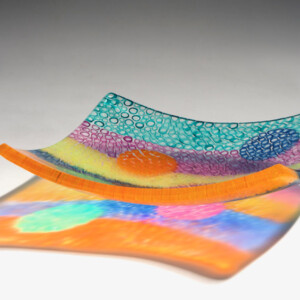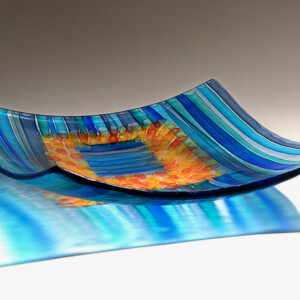Using multiple techniques such as blown hot glass and kiln processes like fusing and slumping, David creates collectable platters and freestanding works inspired by painting, textiles and architecture.