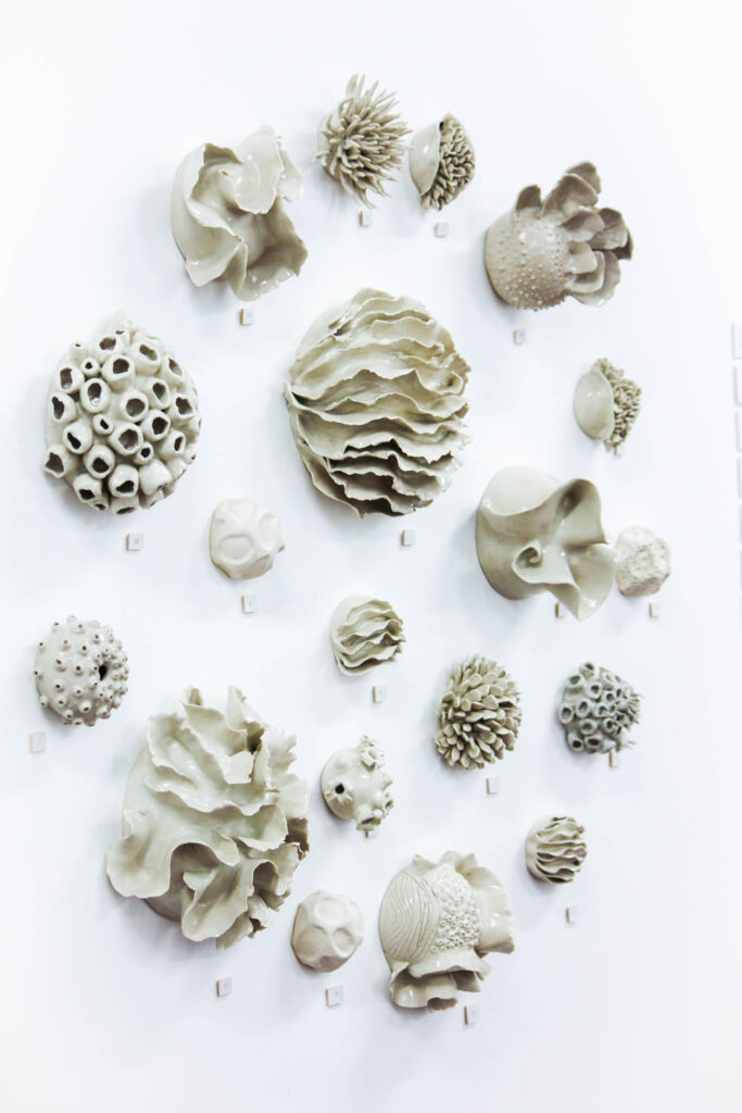 This loss of colour is something that I have represented with detailed close-up objects that are inspired by the reef, indicating not only fragility but the delicate details that are never seen, taking something usually only experienced in photographs into a tangible object. Reminiscent of the paint by numbers from childhood, these white objects sit alongside their coloured counterparts where the juxtaposition of the objects exist as a quiet reminder of what is at stake if we fail to protect these underwater worlds.