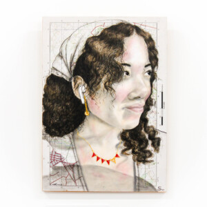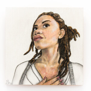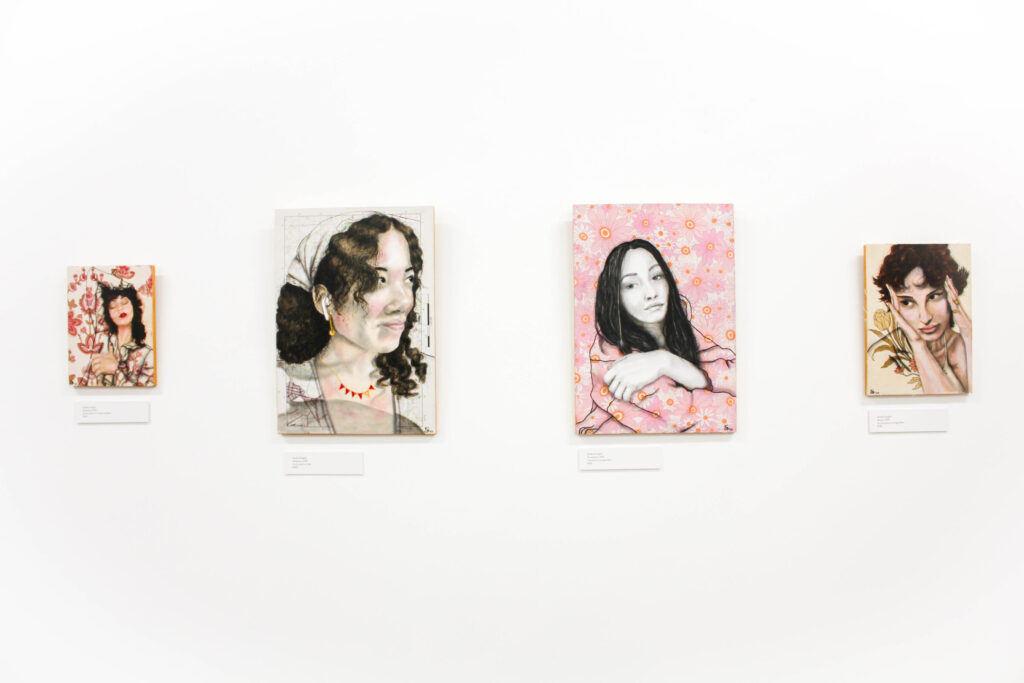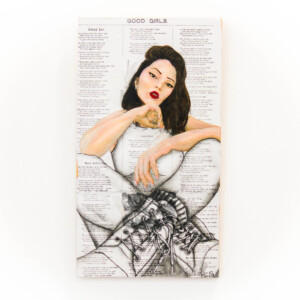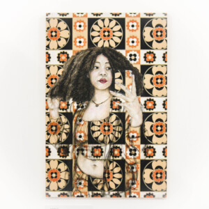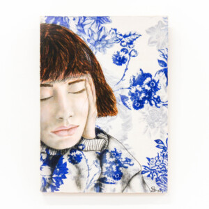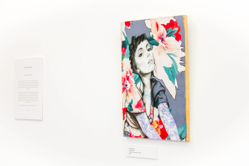 I’m also fascinated by the clothing and décor fabrics/wallpapers that have been designed for women to either wear or use in their homes, and how these materials actually represent what women are expected to ‘be’, rather than encompassing the full spectrum of what it is to be a woman in today’s world. Pairing the expectation with the reality through detailed charcoal or acrylic portraits has been a fascinating and fun experiment – an examination of the outcomes of defiance.