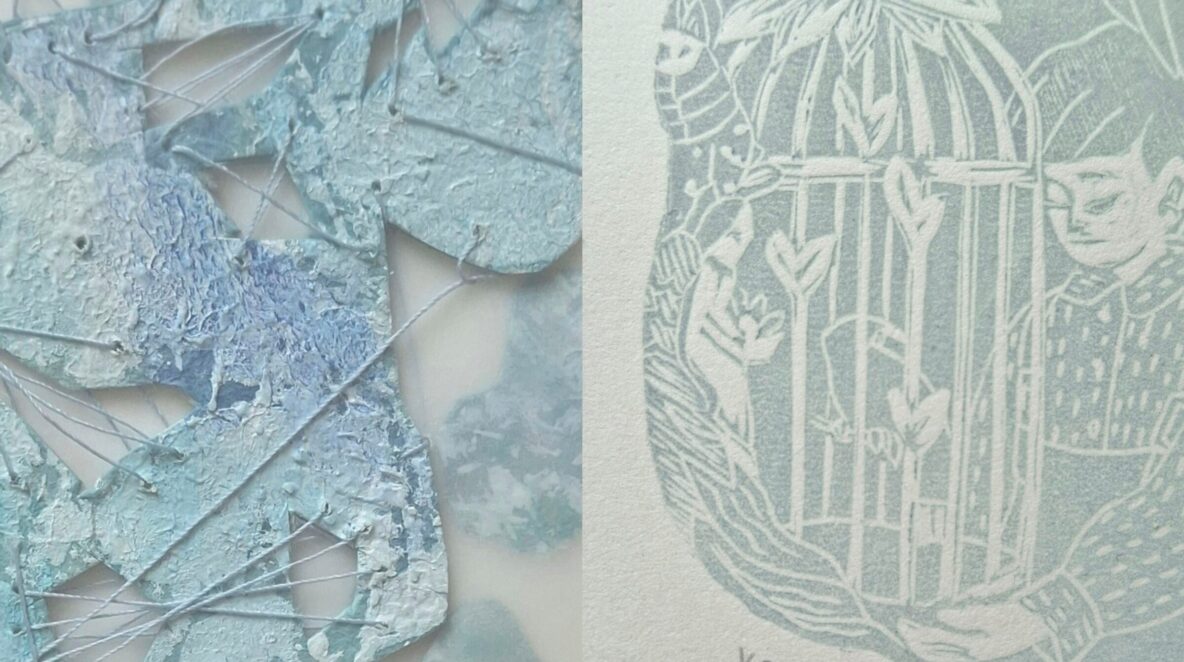 Tying together delicate collages and lyrical linocut prints with subtle colours.
