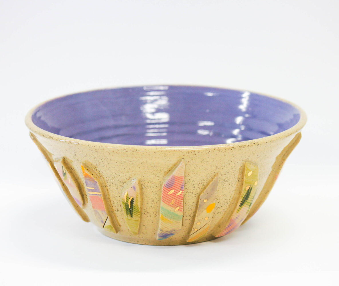 Crush Bowl sarahDecember 10, 2025 Crush Bowl $80 Size: 230mm x 100mm Medium: Clay, Underglaze Paint, Glaze, Gold Luster Status: Sold