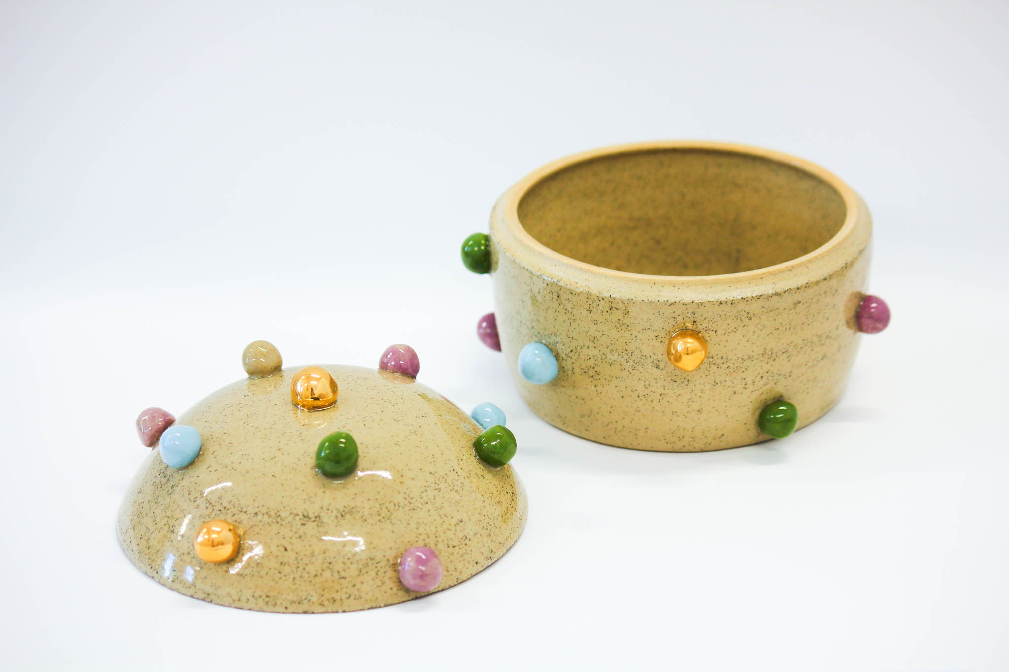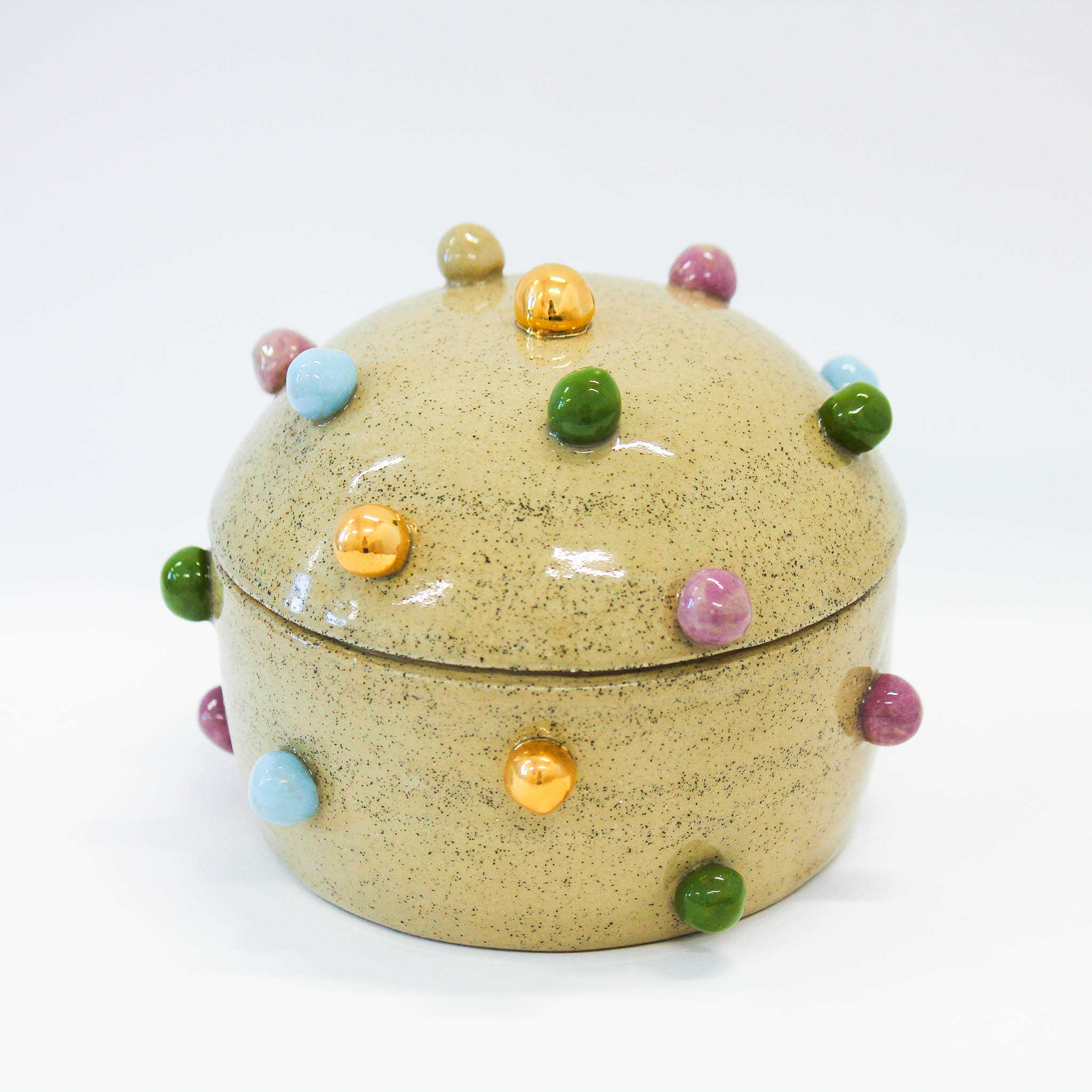 Shiny Balls Pot – Short sarahDecember 10, 2025 Shiny Balls Pot – Short $120 Size: 160mm x 130mm Medium: Clay, Underglaze Paint, Glaze, Gold Luster Status: Sold